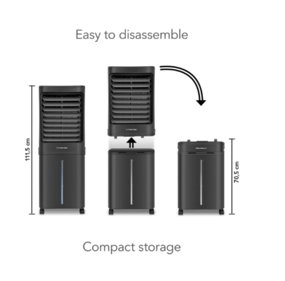 Το PAE 80 έχει δύο τρόπους λειτουργίας για να δημιουργήσει ένα βέλτιστο κλίμα εσωτερικού χώρου: ψύξη αέρα και ανανέωση αέρα. Παρά την ισχυρή ροή του αέρα, η συσκευή καταναλώνει μόνο 125watts ισχύος – καθιστώντας τον ψύκτη αέρα εξαιρετικά αποδοτικό και οικονομικό. Και σε αντίθεση με τα συμβατικά κλιματιστικά, δεν απαιτεί χημικά ψυκτικά μέσα και δεν υπόκειται σε περιορισμούς εγκατάστασης. Αντίθετα: Με τους τροχούς μεταφοράς και την εργονομική χειρολαβή μεταφοράς, μπορείτε γρήγορα και άνετα να μετακινήσετε τον ψύκτη αέρα σχεδόν σε όλους τους χώρους.